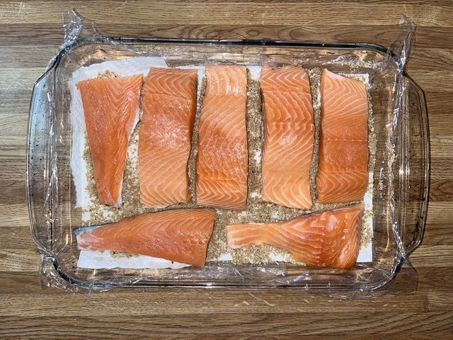 Generously coat all surface areas of salmon leaving nothing uncovered. Cover with Saran Wrap and refrigerate overnight or at least 12 hours