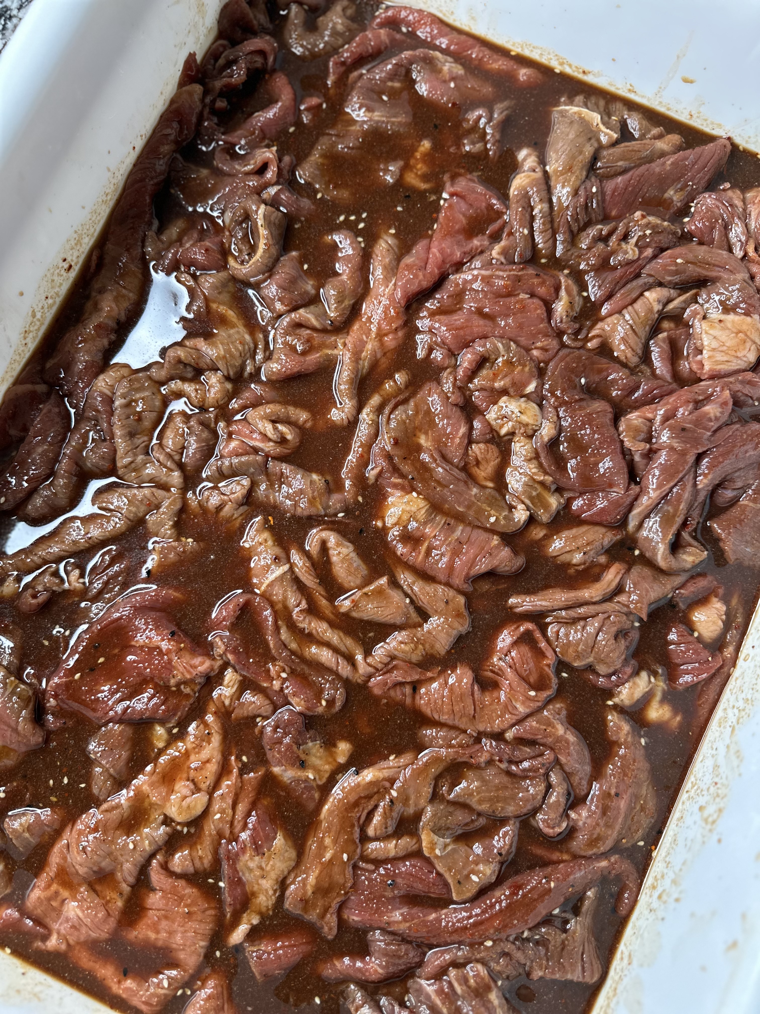 Place the sliced beef in the marinade, ensuring it’s fully submerged, then cover and refrigerate for at least 12 hours (preferably 24), stirring occasionally to ensure even coating.